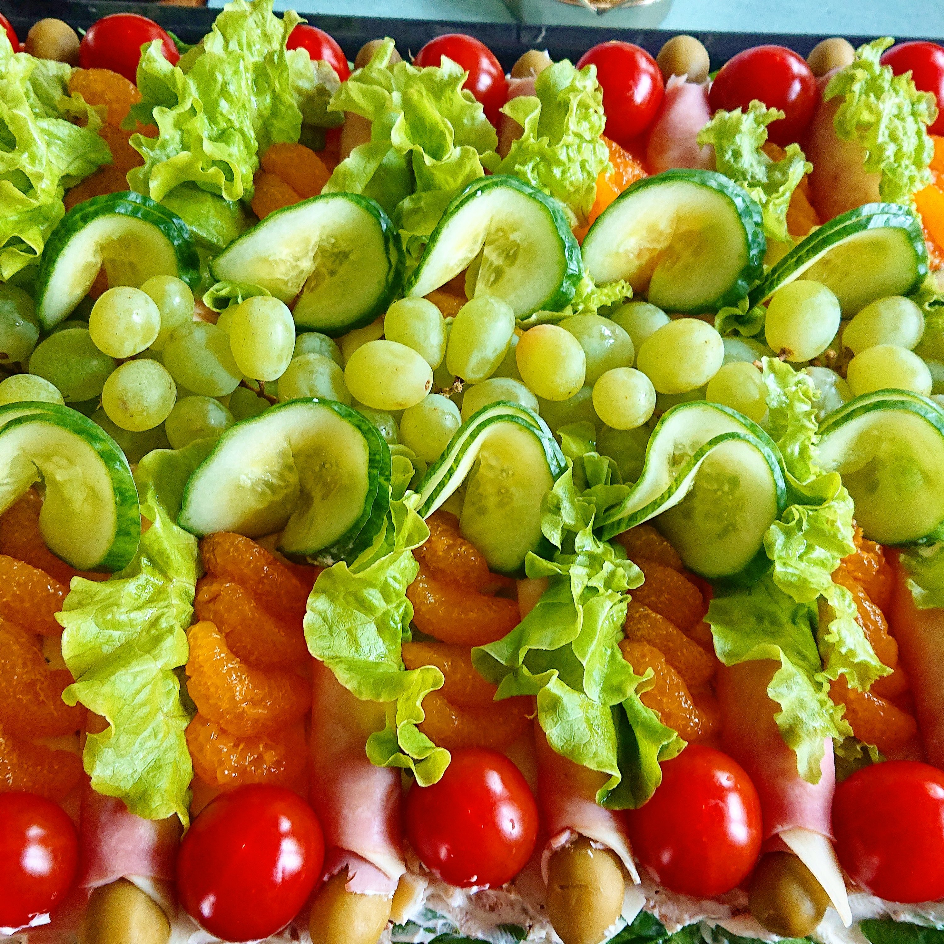 Vegetarisk smörgåstårta är också så gott jag brukar ha pestokräm och färskost med soltorkade tomater som fyllningar och sen toppar jag med ost, paprika, krispsallad, oliver, physalis och vindruvor