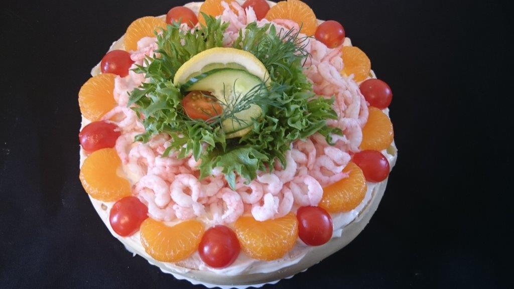 Räktårta fylld med skagenröra och västerbottenkräm och sen toppar man med räkor, tomater, mandariner, citron, dill och krispsallad.