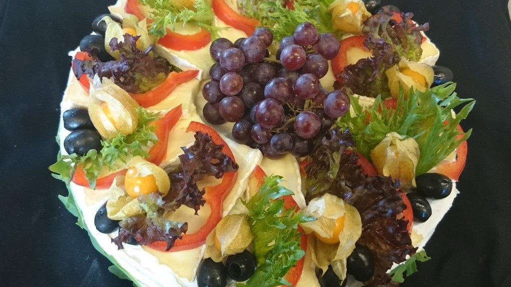 Skink/osttårta med leverpastej och gurka och skinkröra som fyllningar som toppas med mimosasallad, skinka, ost, passionsfrukt, physalis och cocktailtomater och krispsallad.