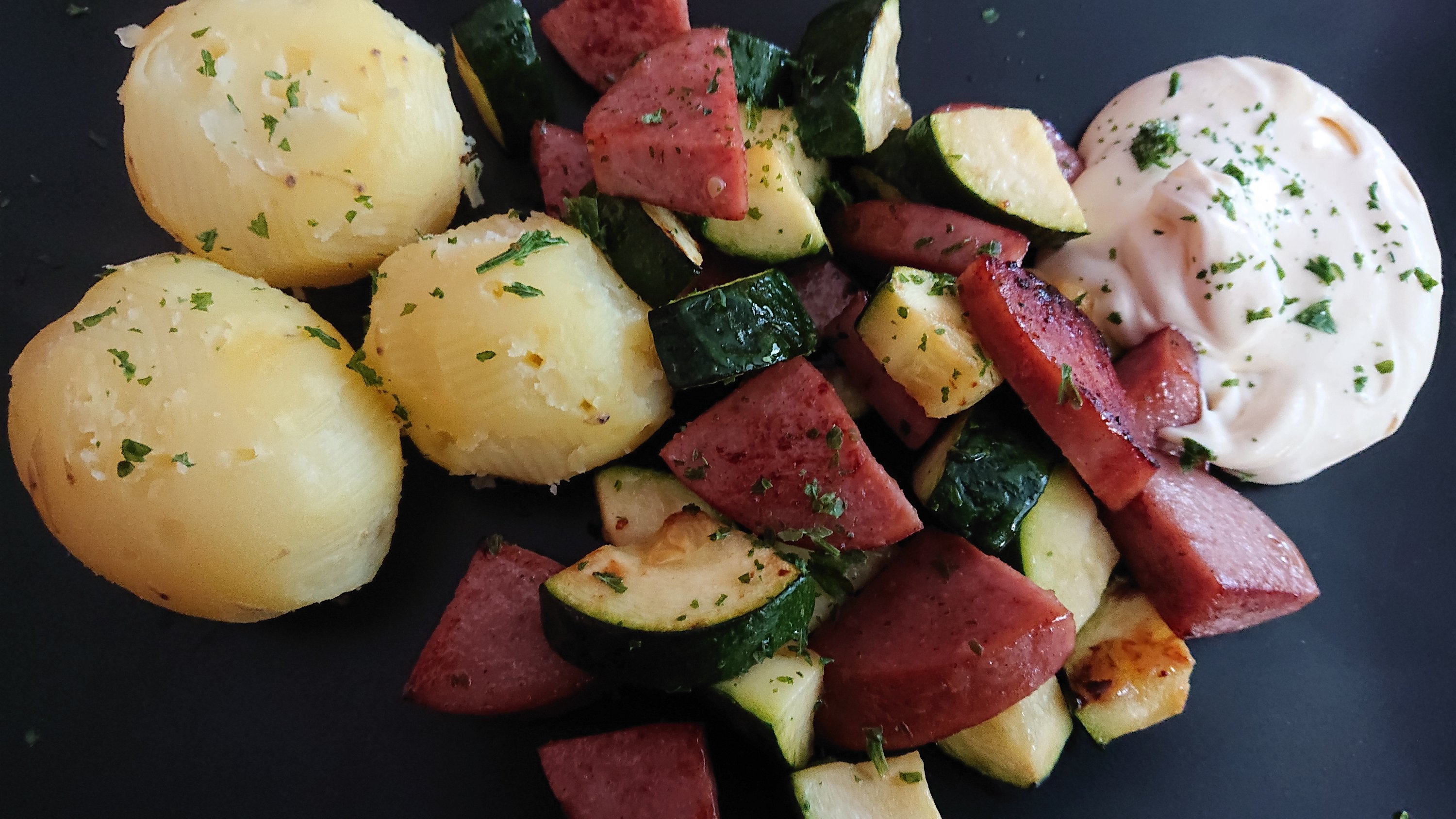 Koka potatisen. Skär zucchini och korv i större tärningar och stek dessa i olja, salta och peppra. Blanda creme fraiche med senapen.