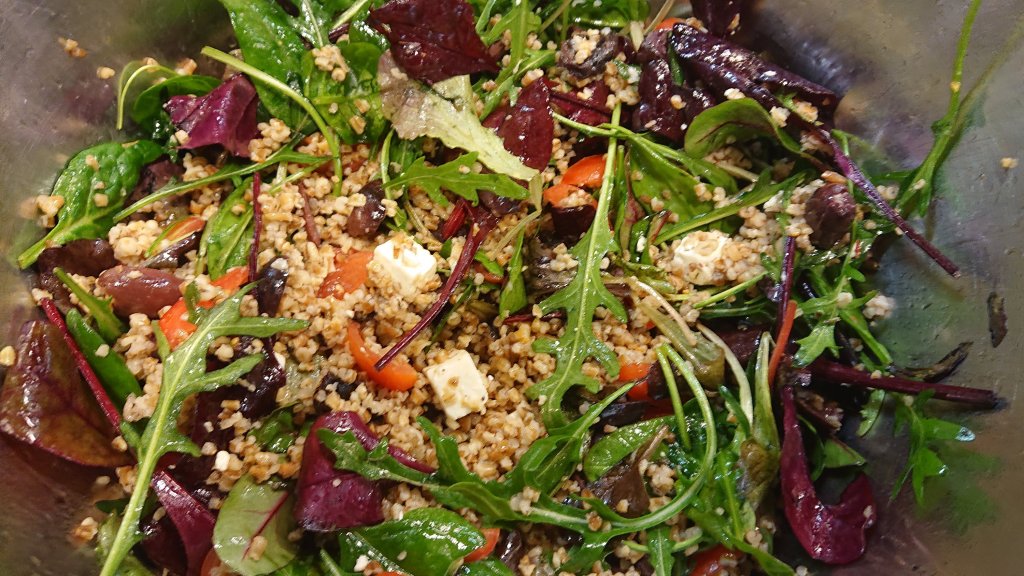 Jag brukar blanda de avsvalnade grynen med mixad sallad, marinerade polkabetor, fetaost i olja och örter , rödlök, oliver och körsbärstomater (gärna i olika färger). Använd oljan från fetaosten och ringla den över salladen ger fin och bra smak. Självklart kan man också skapa sina egna salladsblandningar med olika grönsaker man gillar. Gå gärna in på okinordiska.se och få mer inspiration.
