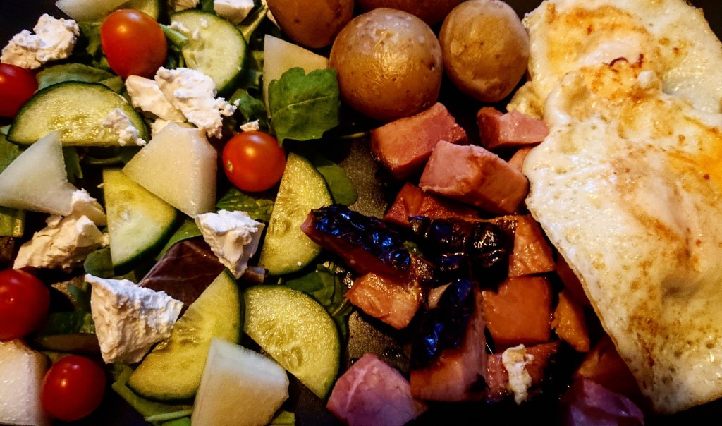Idag har det varit både fint o lite höstligt väder. Då blev jag sugen på bräckt skinka, stekt ägg, potatis och en sallad med gurka, vitost, tomat och snowball melon. För er som inte testat denna nya melon, gör det, den är lagom söt o frisk.