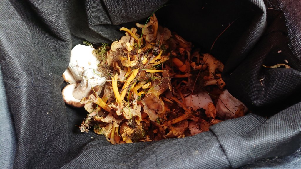 Kan verkligen inte klaga på dagens svampfynd det blev kantareller, trattkantareller, Karl Johan och citrongul slemskivling. Blev som vanligt spännande när vi skulle ut ur skogen, vi är mästare på att hitta viltstängsel, men ut kom vi lite trötta o slitna. Tre vildsvin fick vi se på håll också, hade inte velat att de kom närmre.