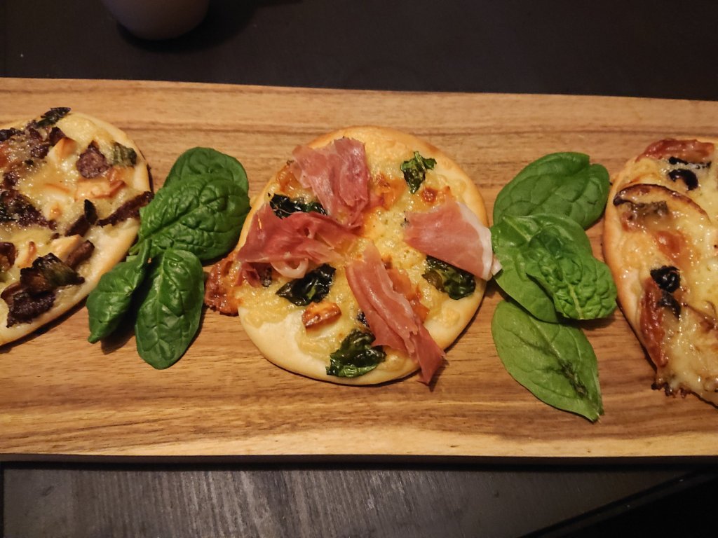 Minipizzor med olika toppning, spanska getosten monte enebro, philadelhia, pizzaost finns på alla. Sen är det på 1. äpple, hasselnötter o flytande honung (ringlas på efter gräddning) , 2. kantareller o salladslök, 3.basilika o efter gräddning toppat med prosciutto crudo. Monte enebro har en god skorpa av blåmögel, kostar lite extra men sååå god, finns i manuella ost disken på City Gross Boländerna.